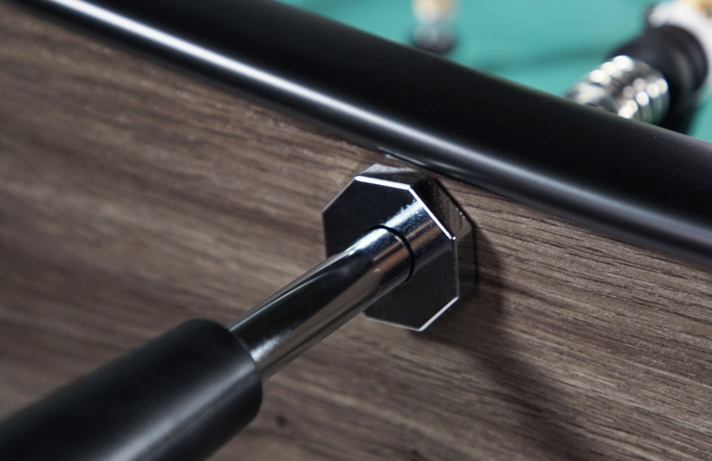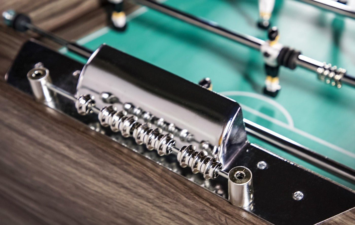 Nous avons designés des joueurs en métal avec des jambes musclées et un torse digne d'un vrai footballeur ! Tous peints à la main, ils sont noir et argent pour s'accorder à la couleur de la caisse. Et pour plus de contrôle, les pieds des joueurs sont striés pour mieux accrocher la balle.